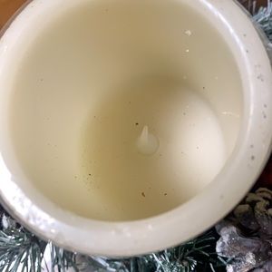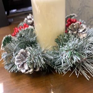 Battery operated candle surrounded by faux greenery berries and pinecones 7 inches high. Never used