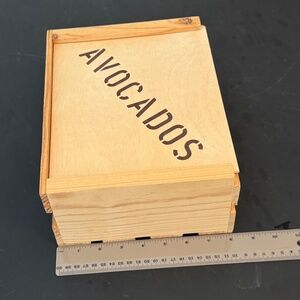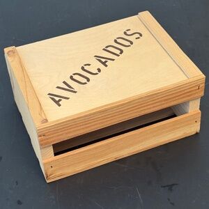 This is a decorative wooden crate labeled “AVOCADOS.”