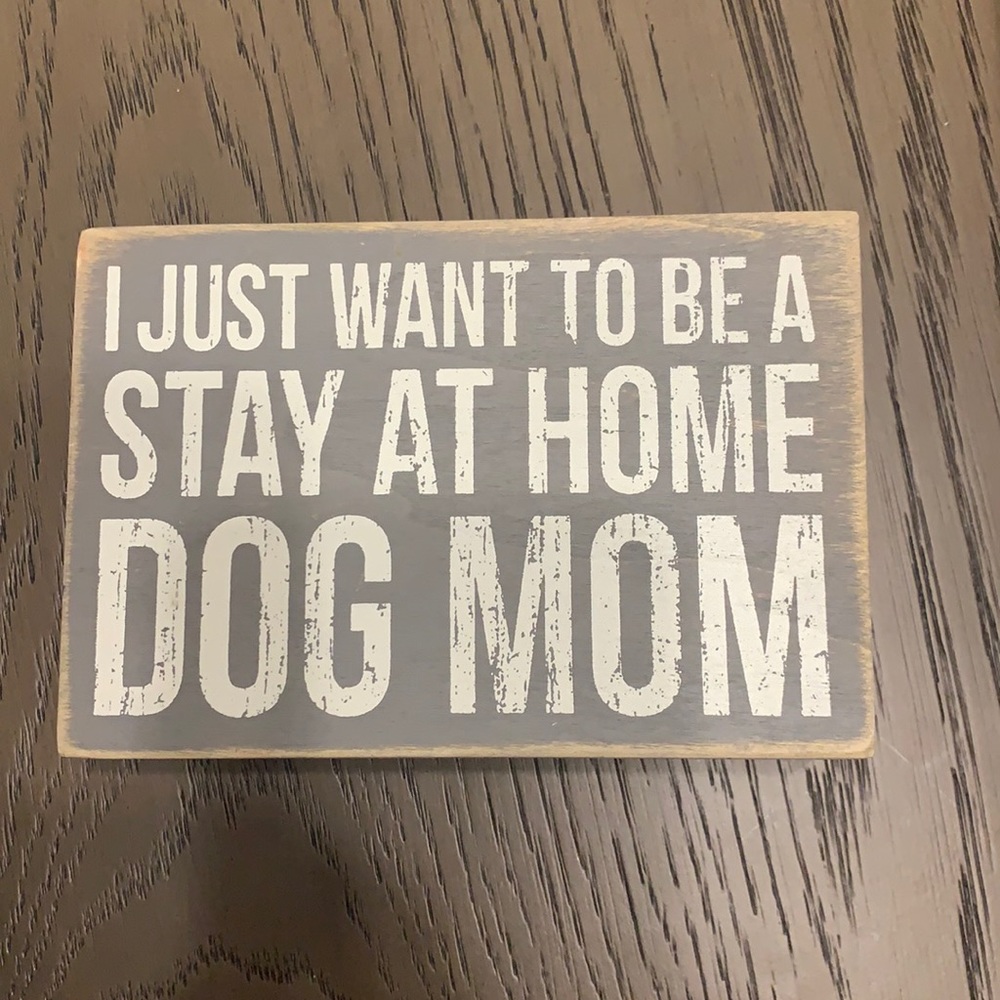 Super cute decorative sign that reads: I Just Want To Be A Stay At Home Dog Mom. The color is a distressed light grey with white lettering and paw prints around the sides. Measures 6” X 4”. Check out my page for ways to bundle and save!