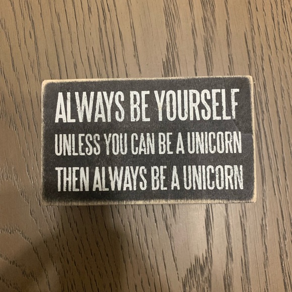 Super cute decorative block sign reads: Always Be Yourself. Unless You Can Be A Unicorn. Then Always Be A Unicorn. It’s distressed black with a cute chevron pattern along the sides. It measures 5” x 3”. Check out my page for ways to bundle and save!