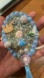 Charming blue hand mirror adorned with various embellishments including a castle, character figure, and sparkling gems.
