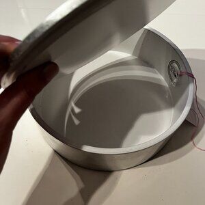 This is a listing for a circular decorative box with a lid. This would look great on an end table, den table or even in a mantle and can be used to hold a variety of items. It could even be use in a bathroom to hold miscellaneous items.