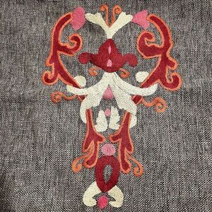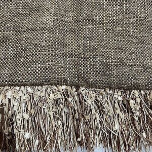 In gently used condition. The shag decorative pieces make it difficult to open the zippered portion to insert your pillows so be careful to not get those caught in the zipper. Dry Clean only.
