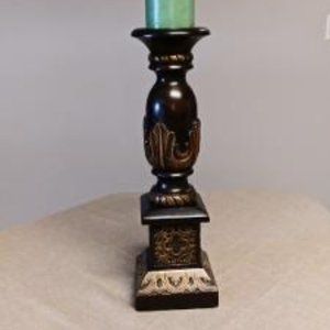 This dark stained, carved wood and embossed candle holder is made in India. It has a brown finish with bronzy gold carvings and embossed details. The candle holder is 18"h X 5.5"d X 5.5"w. It is in good condition, and the green candle stick is not included.