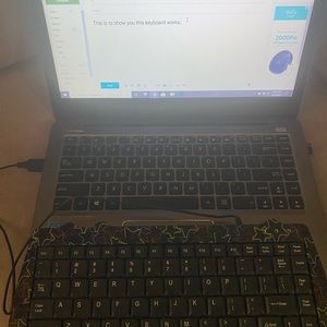 Computer keyboard with USB to use for desktop computer. Decorative for kids/students to use while doing school work at home during this trying time.