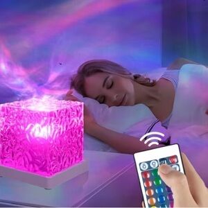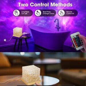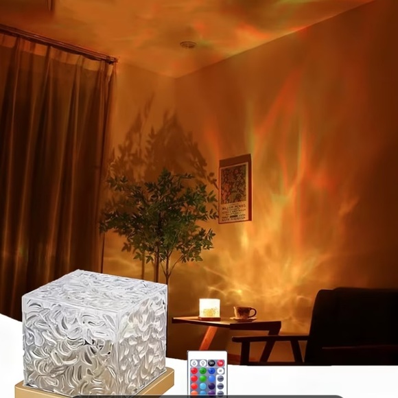 Textured cube lamp with patterned surface. Emits warm amber and orange projection. Comes with color remote for multiple settings. Stylish accent for tabletop or shelf.