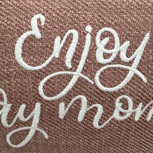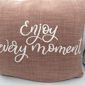 Add a touch of mindful elegance to your space with this charming blush pink throw pillow featuring delicate white embroidered text 'Enjoy Every Moment'. Perfect for creating a cozy reading nook, adorning your sofa, or bringing warmth to your bedroom sanctuary. The textured fabric adds depth while the inspirational message serves as a daily reminder to embrace life's beautiful moments.