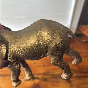 Elegant elephant figurine. Perfect for home decor. Adds a touch of nature. It is made of plastic and was painted gold. Some of the paint has come off.