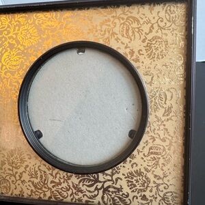 Square antique frame with ornate gold patterned front. Circular photo opening. Classic, decorative look. See pic for measurements