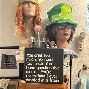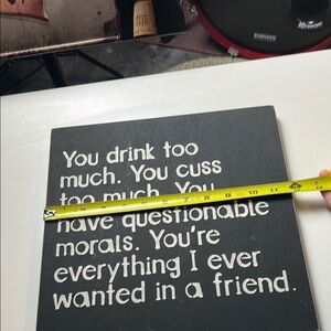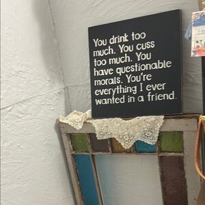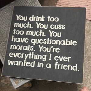 Great wooden, black sign with cream lettering. No brand. A rustic, slightly weathered patina, and a really funny message, which reads, “You drink too much. You cuss too much. You have questionable morals. You’re everything I ever wanted in a friend.” We all probably know an individual who would aptly fits that description or maybe it applies to yourself. :) Please see photos for details and measurements. Metal hanger on the back.