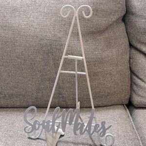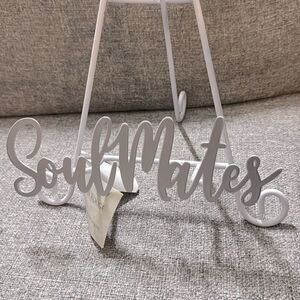 Elegant metal display stand with decorative scroll design. Features 'Soulmates' text in stylish script lettering. Perfect for home decor or event displays.