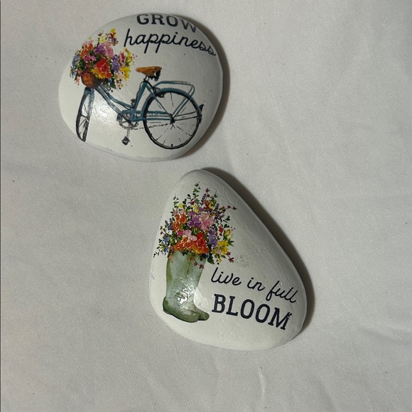 Set of two decorative stones featuring floral designs. One stone has a bicycle with flowers, and the other has a boot with flowers. Perfect for garden or home decor.