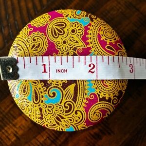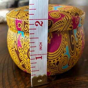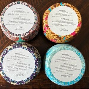 Beautiful set of four round candles with intricate patterns. Features vibrant colors including blue, red, and gold. Perfect for home decor or gifts.