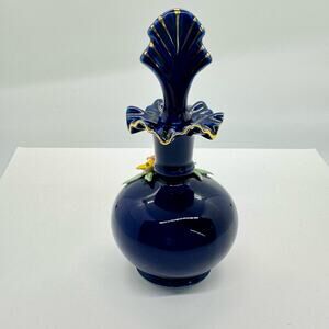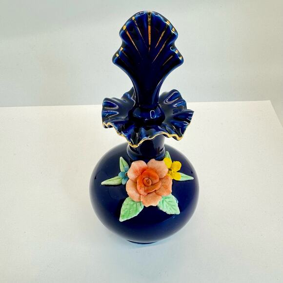 Decorative Perfume Bottle w/ Stopper Rose Flower Cobalt Blue Gold Ruffle Trim