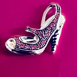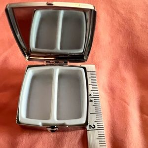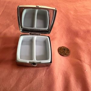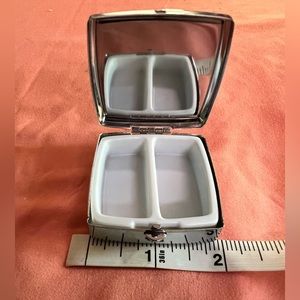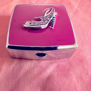 Playful Square pill case with jeweled shoe design, has two compartments and mirror. Fits easily into a purse. Makes a great gift!