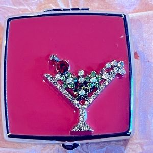 Square pill case with martini glass design, has two compartments and mirror.