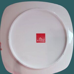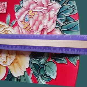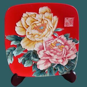 This intricately designed ceramic plate features a vivid red background with detailed floral relief artwork. Crafted from fine porcelain, it serves as an elegant decorative piece or collectible.is in great condition without box from smoke and pet free home