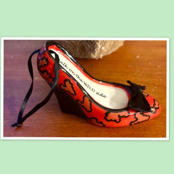 “Walk On The Will Side” miniature shoe ornament. It is a collectible Christmas ornament, featuring a red and black animal print design with a black bow accent. The specific phrase "walk on the wild side" is printed on the insole of the shoe.