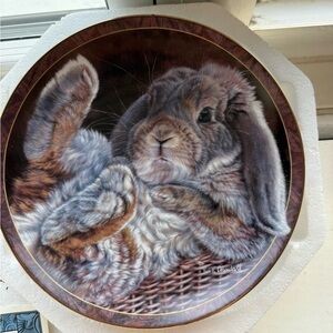 Charming decorative plate featuring a lifelike rabbit design. Perfect for animal lovers and collectors. Bradford Exchange collector bunny plate with authenticity paper and in original packing