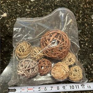 Set of 8 decorative rattan balls in various natural shades. Perfect for home decor or craft projects.