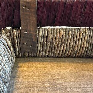 This intricately woven basket is designed for decorative use, offering a rustic charm and practical handles for easy positioning in any interior space.