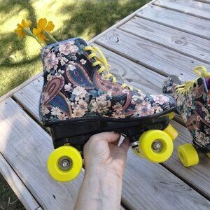 These skates are just for decoration not actual use! They are meant to be a cute home decoration. Weather you want to put fake flowers in them or just leave than as they are. Made with Paisley fabric, the tounge has pink fuzzy fabric and the wheels were painted yellow to refresh them. The back has blue metallic paint for a nice finish. Could be cute next to some plants 🌿