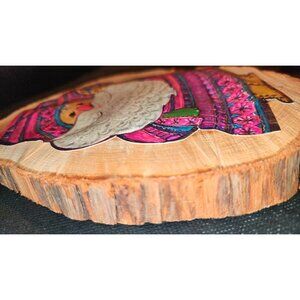 This hand-painted Santa Claus wood slice ornament adds a charming holiday touch to any decor. The colorful details and rustic wood texture make it a unique piece. It includes a red yarn hanger for easy placement on trees or walls.
