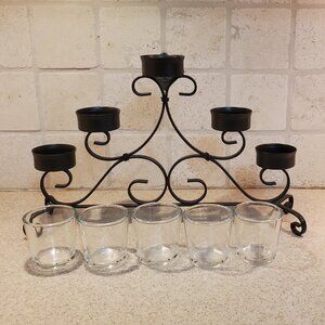 Set of 5 glass votive candle holders in a beautiful scrolled metal holder