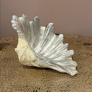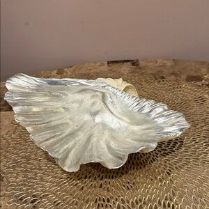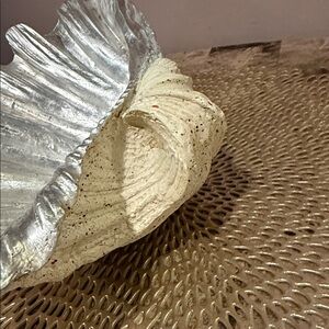 Beautiful decorative shell dish for stylish home or outdoor (covered area) display. Features a metallic silver-leaf interior and natural textured exterior.