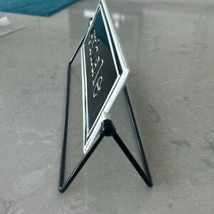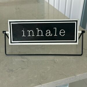 Black and white sign on black metal A frame stand. Sign flips over to display opposite side. One side spells “inhale” and opposite side spells “exhale”