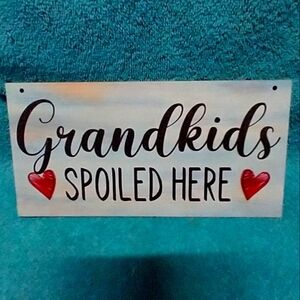 Charming sign with 'Grandkids Spoiled Here' text. Features bold black lettering and red heart accents. Perfect for home decor.
