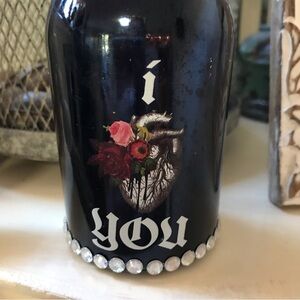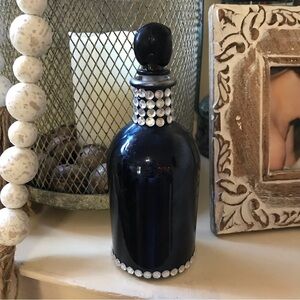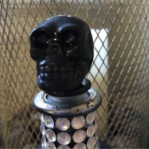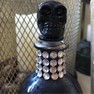▪️Decorative Skull Bottle ▪️Black Glass ▪️Adorned with Faux “Rhinestones” ▪️Removable Skull Topper ▪️New ▪️Excellent Condition