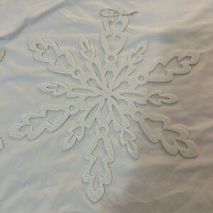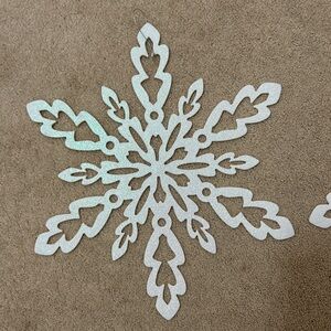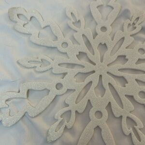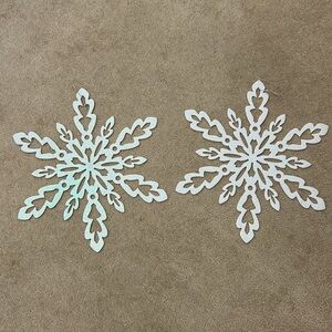 Elegant snowflake designs. Perfect for holiday decor. Adds a festive touch. They have a white sparkle look to them. 15 inches across and diameter. Set of two.