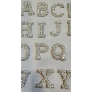 Decorative white sparkling rhinestone & pearl letter patches for iron on or sew on, containing 24 letters.