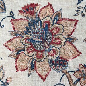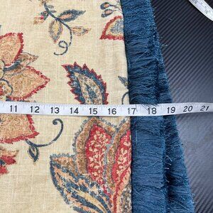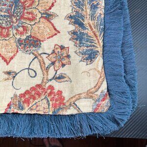 The pillow cover features a vibrant floral design with a bold blue fringe trim, adding a touch of elegance to home décor.