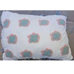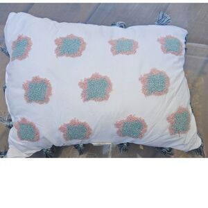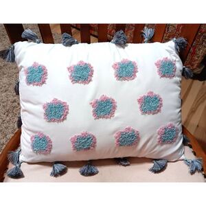 Decorative Throw Lumbar Pillow White Pink Aqua Hook Loop Tassels 11x14 Inch