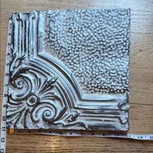 Elegant decorative metal tile with intricate design. Features a silver and black color scheme.