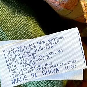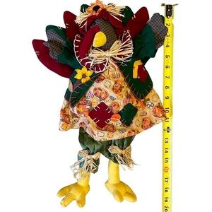 This festive, adorable, Turkey shelf sitter sits 8 inches high, but is actually 19 inches tall. It’s width is approximately 14” wide. It is stuffed with polyester fiber and pebbles. It is adorned with straw, cotton fabric and felt pieces and patches. A cute button accent, beaded eyes, and stitch work add that handmade original feel to this decorative turkey.