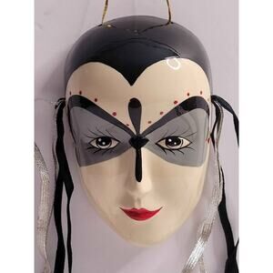 This is a vintage painted ceramic face mask, featuring a stylized design with a black top resembling hair or a cap, a pale face with prominent grey eye makeup, red lips, and red dots on the forehead and cheeks. Black and silver ribbons with small bells attached at the ends hang from the sides, adding a decorative element. This type of mask is often used as a wall-mounted decorative piece.