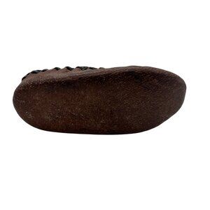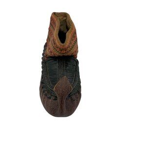 Unique vintage miniature leather shoe, approximately 5″ long, featuring intricate stitching and a textile upper with striped pattern. The curled toe adds whimsical detail, while the soft leather sole and fabric boot cuff suggest decorative or collectible use. A charming accent piece for collectors of miniatures, folk art, or decorative footwear.