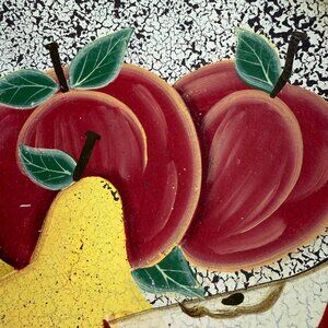 Decorative Wooden Bowl Painted Fruit Apple Pear Design Farmhouse Rustic Decor. HAS ALOT OF DISTRESSING AND SIGNS OF WEAR, CRAZING, CRACKLE FINISH. Unbranded. Nice decorative piece for your farm, country, cottage core look.