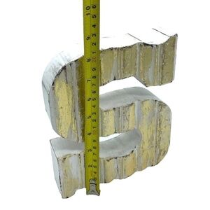 Add a pop of shine to your decor with this decorative "S" initial on display. Made of wood and painted with a white finish then finished with a weathered gold detailing, this piece gives a little pop to to shelves, tables, or wherever you want to display it.