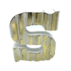 Add a pop of shine to your decor with this decorative "S" initial on display. Made of wood and painted with a white finish then finished with a weathered gold detailing, this piece gives a little pop to to shelves, tables, or wherever you want to display it.