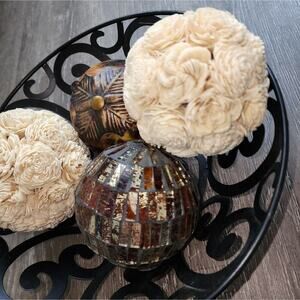Decorative bowl with ornaments rosettes and glass balls neutral tones