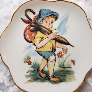 Adorable vintage decorate plate to accent any wall. Features a young boy walking with an umbrella and sack.