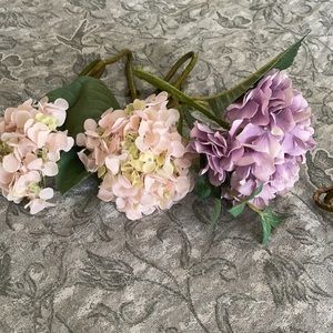 Decorative hydrangeas, 2 light pink, 1 darker pink, and 4 white. Sold separately, $5 each.