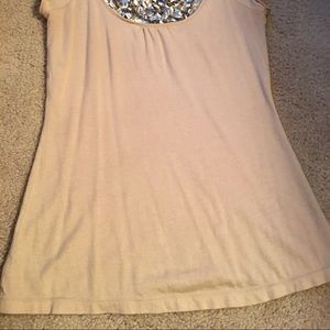 Taupe colored, capped sleeve tee with sequin embellishments at neckline. Very fitted.