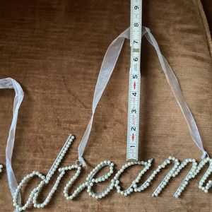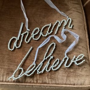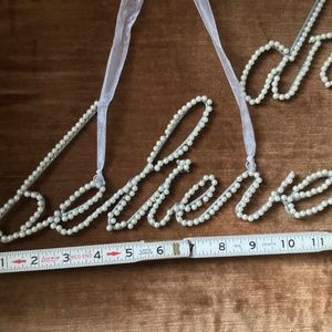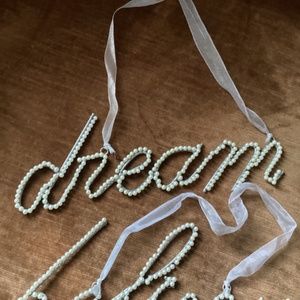 Decorative wall hangings with faux pearls and ribbon for hanging “believe” and “dream”