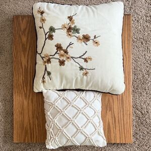 Elegant cream pillow featuring a unique knotted design. Larger pillow is embroidered flowers. Perfect for adding a touch of soft style to any room.