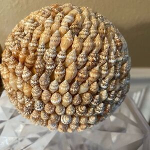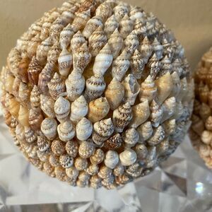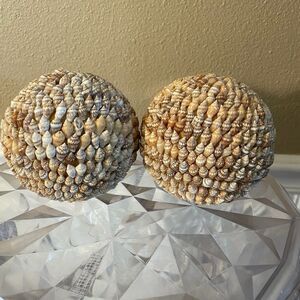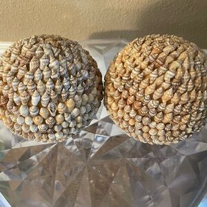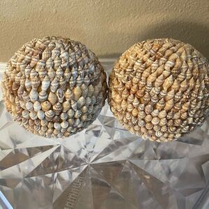 Really nice! Two bigger sea shell decorative balls. One ball is missing one shell(pictured!)! Wasn’t on my watch! Can barely notice! Roughly 4x4. They are beautiful!